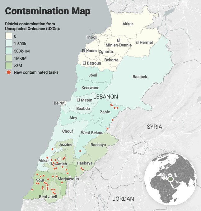 Despite repeated Israeli violations of the ceasefire with Hezbollah,Lebanon remains off the Global Mine Action Programme’s (GMAP) priority list after being removed in 2021.