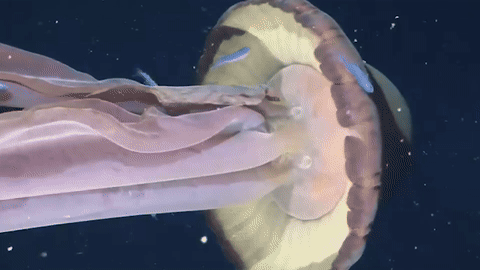 In the clip,the jellyfish’s translucent,bell‑shaped body is lit up by the ROV’s lights as it appears to be swimming downwards while small fish surround it.