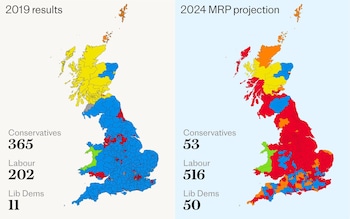 Labour is forecast to have 516 seats and an estimated House of Commons majority of 382 – double that won by Sir Tony Blair in 1997 – as Sir Keir Starmer becomes prime minister.
