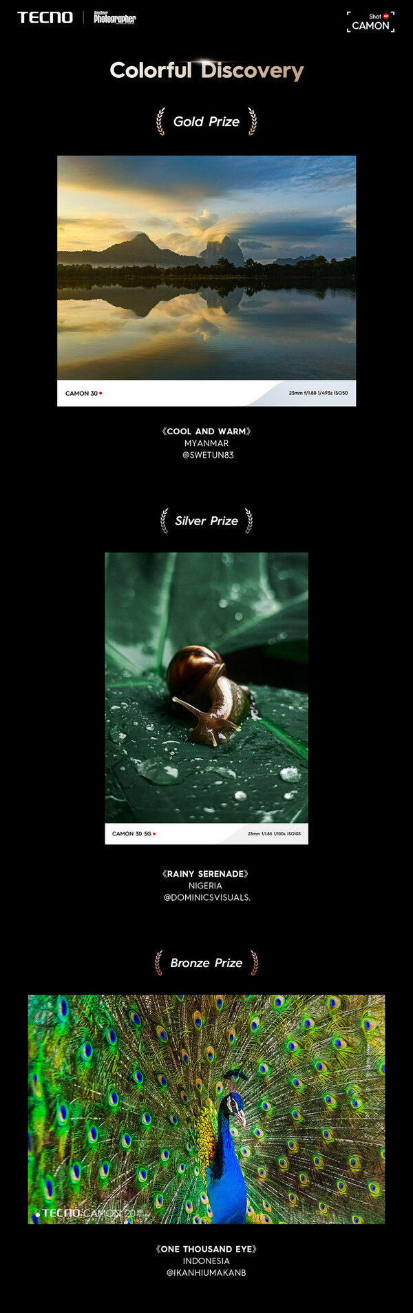 In the Colorful Discovery category,the Gold Award was won by a beautifully captured piece that showcased the majestic natural landscape of Myanmar,where the tranquil waters and layered sky merges into each other. The Silver Award was bestowed upon a piece that portrays the delicate interplay of light and shadow during rainfall,revealing the serene world of a lone snail. The Bronze was awarded to a shot that showcases the vibrant colors and intricate feather patterns of a peacock. These winning images highlight the vivid and diverse colors found in landscapes and animals,demonstrating not only technical mastery but also an eye for vibrant color that truly defines this category.