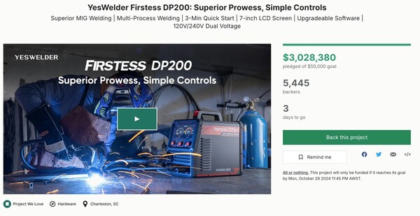 HaiPressNEW YORK,Oct. 25,2024 -- With just days left,the buzz around YesWelder's revolutionary Firstess DP200 is growing,and now's your last chance to get in on this incredible opportunity. The record-breaking Kickstarter campaign,which has captured the welding community's attention,ends in just three days.