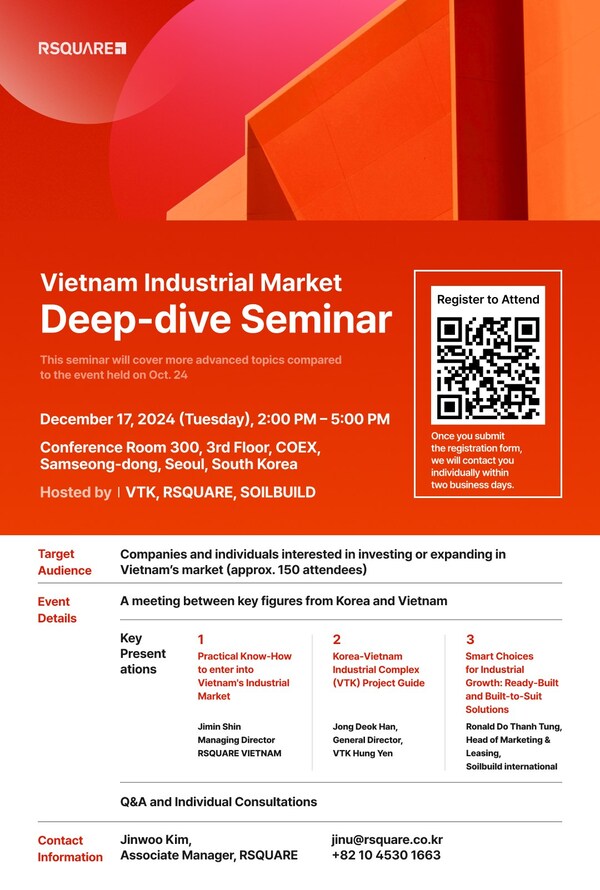 RSQUARE Vietnam will host the "Vietnam Industrial Real Estate Investment Seminar" on December 17 at COEX,Seoul,offering insights into market opportunities and investment strategies.