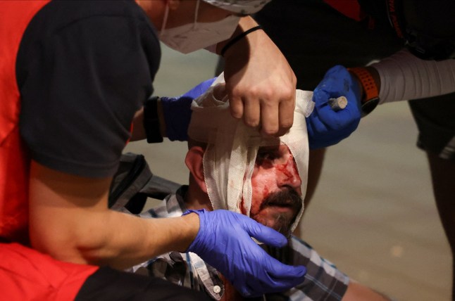 Medical personnel assist an injured demonstrator in Belgrade (Picture: Reuters)