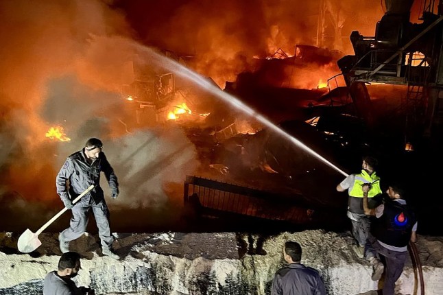 Firefighters and civil defence teams try to extinguish the fires following the Israeli attack targeting a factory in Ansar,in southern Lebanon on October 16,2025 (Picture: Getty)